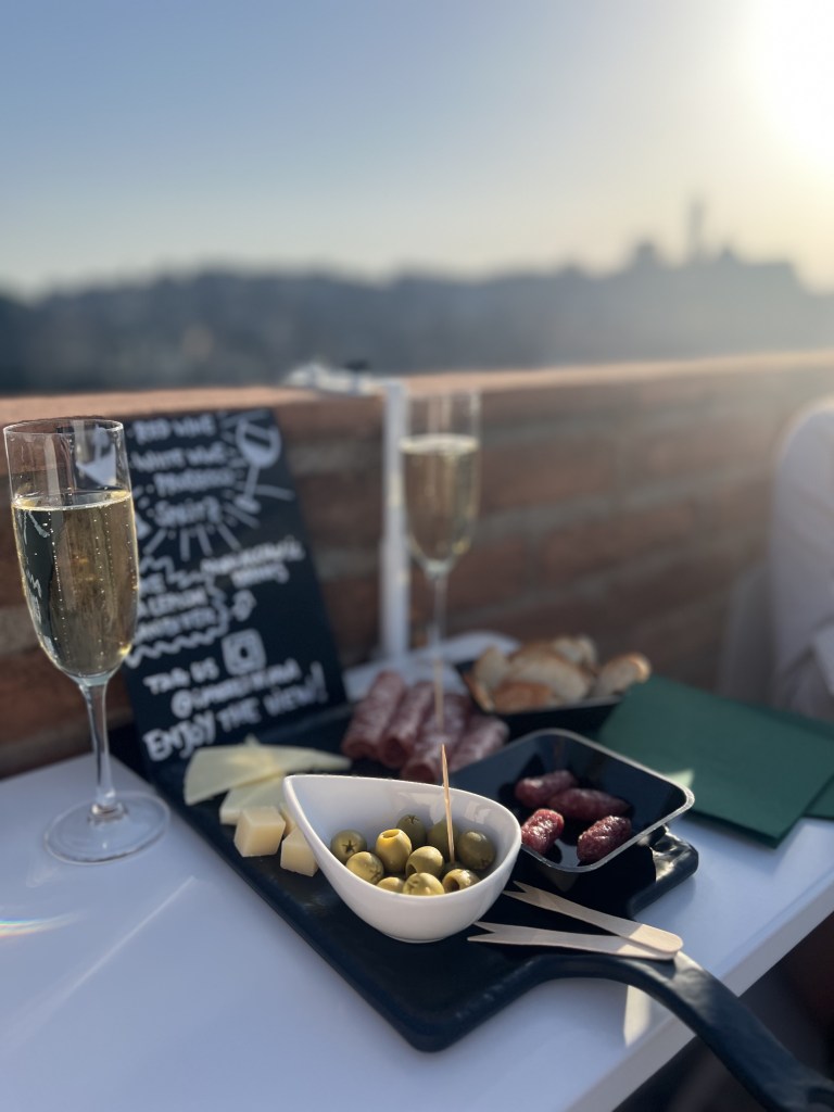 En twijfel je over het hotel? I Merli di Ada is een aanrader met een geweldig dakterras. Tijdens een gezellige borrel die ’s avonds werd georganiseerd, genoten we van een glas prosecco met heerlijke hapjes. Het uitzicht over de stad was adembenemend en maakte de ervaring helemaal af. Het was de perfecte manier om de dag af te sluiten en even te ontspannen met een prachtig Siena als achtergrond. Gewoon genieten!