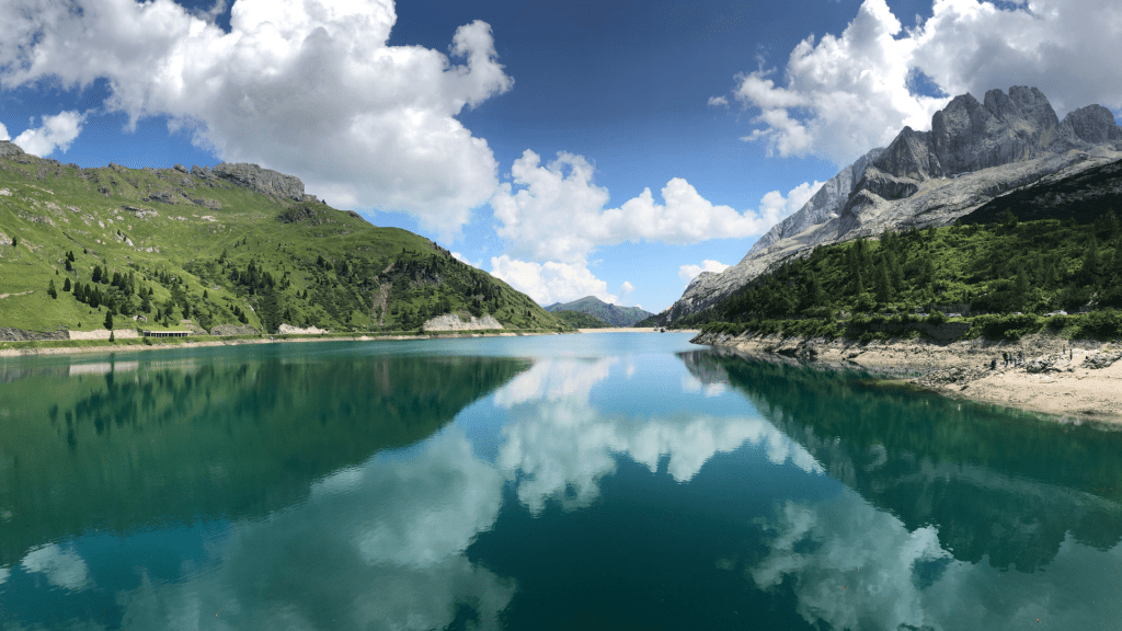 Dit meer ligt aan de voet van de Marmolada, de hoogste berg van de Dolomieten. Dus als je